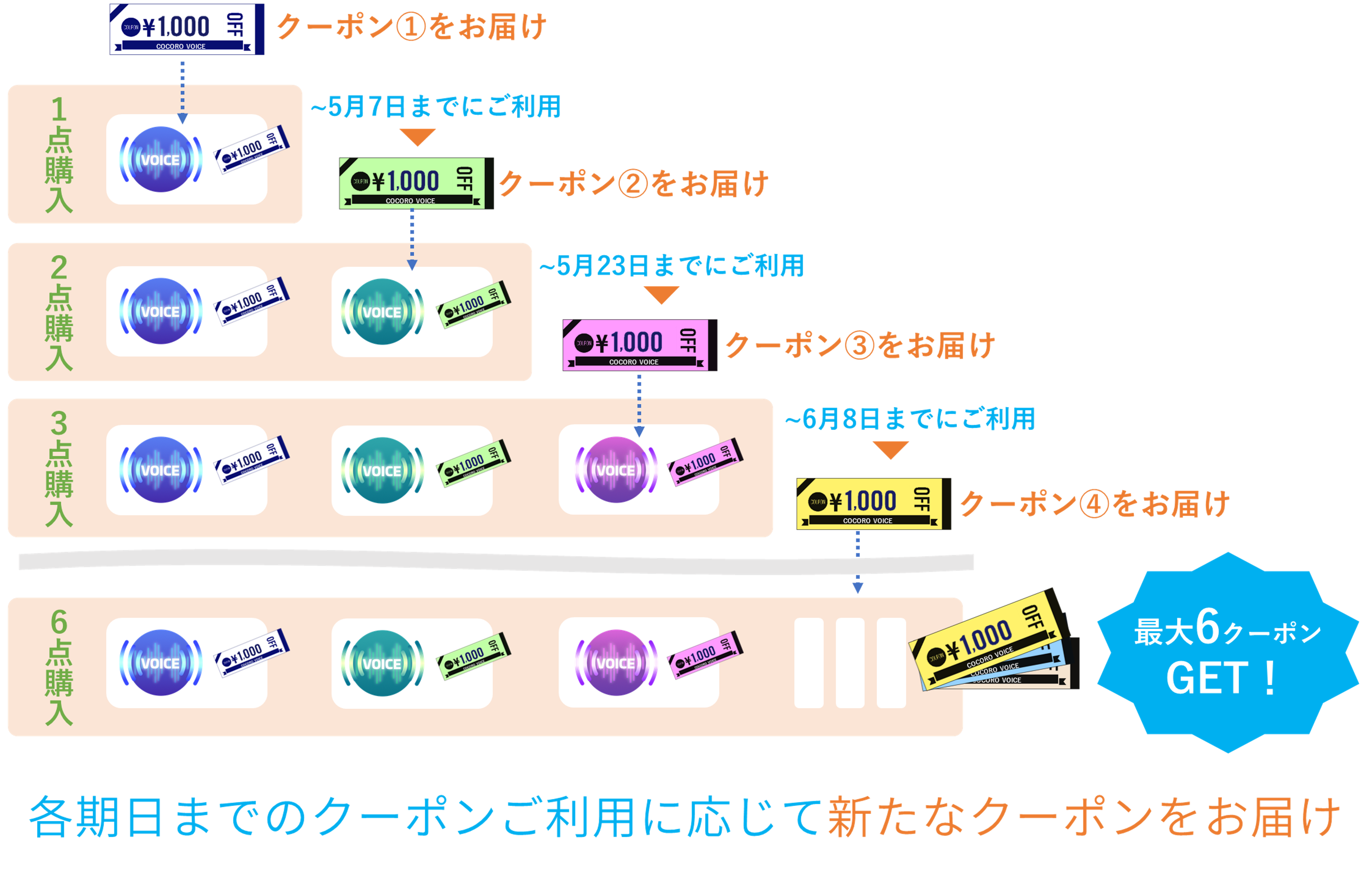 COCORO VOICE1周年キャンペーン第5弾は、これまでにご購入いただいた皆様に感謝の思いを込めて、使えば使うほど、お得になる!最大6,000円分のクーポンがもらえるキャンペーンを開催します!