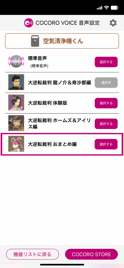 ②メール受信後「COCORO HOMEアプリ」をご確認いただくと、アイリスのアイコンが入った「おまとめ編」が追加されています。追加された「おまとめ編」を選択し「設定する」を押していただくと、ボイスが「おまとめ編」に変更されます。