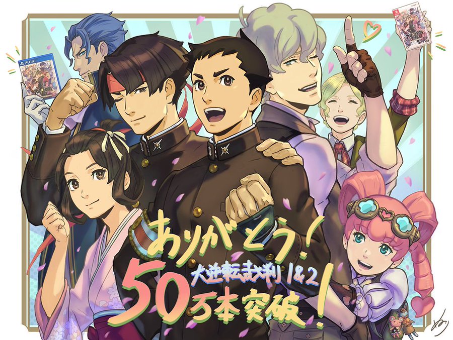 今回のシャープさんの件とは別ですが、大逆転裁判の10周年用の集合絵では、今までにやってなかった新たなチャレンジとして画面上のキャラ全員分の全身を描きました。 |