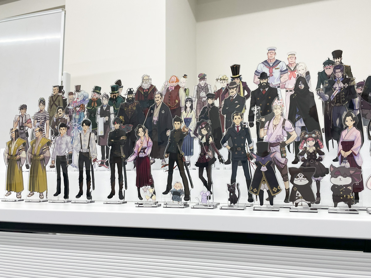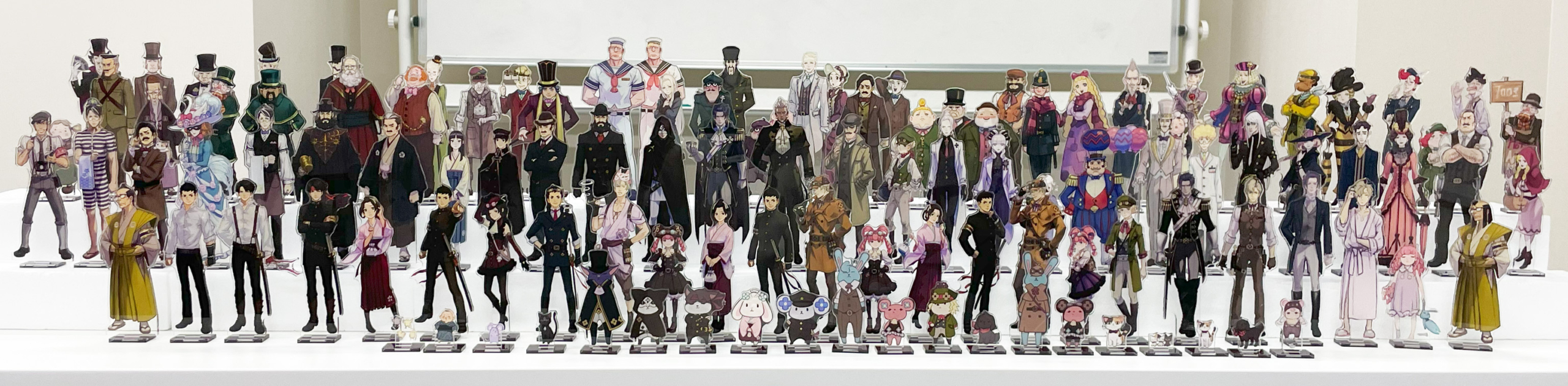 コラム後編です。改めてアクスタを紹介していこうと思います。おさらいとなりますが全2種類、大逆転裁判,大逆転裁判2に登場したキャラクターをそれぞれセットにしています。登場キャラはワガハイなどを含めると128体、アクスタ自体でいうと複数キャラで1個となっているものがあり全部で123個となります。なかなか類を見ない数とレアなキャラクターを登場させることができました。 |