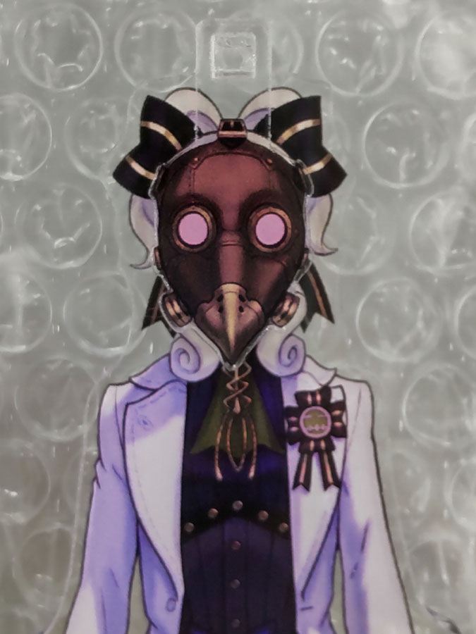 それで、アクスタを作ってくれた制作会社の担当者さんに「アクスタを上下に重ねたらマスクみたいになりますかね?」って。実験をしてもらったら、なんかそれらしくなって。 ただ、実験時は仮面の厚みがアクスタと同じで横から見たらえらい事になってて、担当者さんが品質が保てるギリギリまでプレートを薄くしましょうって実験に付き合ってくれました。無事に顔も見れるし仮面もつけられることになりました。 |