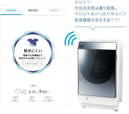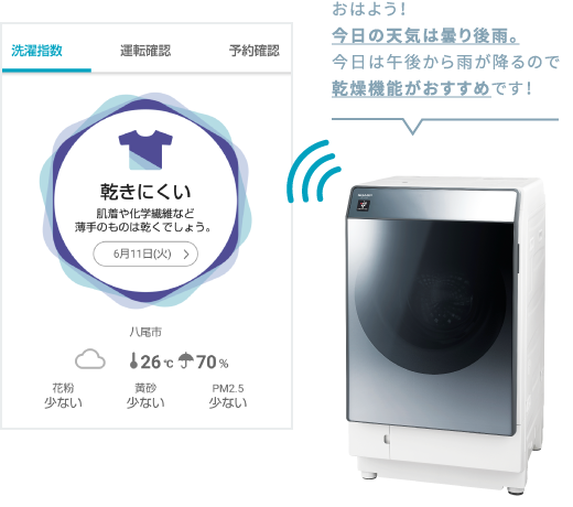 シャープ独自のAIoT技術によって、お客様の状況に最も適した洗濯をオススメします。季節や天候、洗濯指数に合わせた洗濯方法はもちろん、ベストな洗剤量やカーテンや布団など、お洋服以外の洗濯までお任せください。