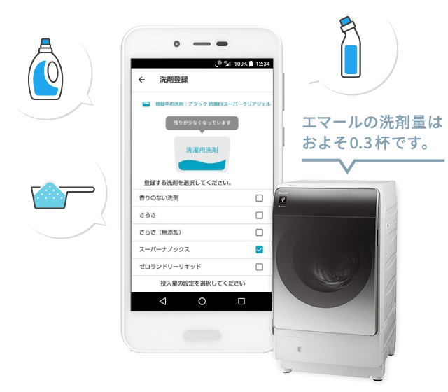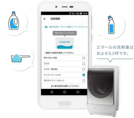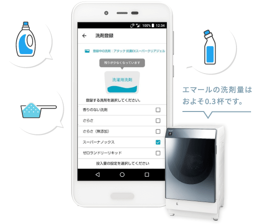 普段使っている洗剤をCOCORO WASHに簡単登録するだけで、洗剤の銘柄に合わせて最適な量を教えてくれます。適切な洗剤量でのお洗濯は大切なお洋服へのダメージを軽減し、長く楽しむことができます。また洗剤を使い分けている方にもおすすめの機能です。