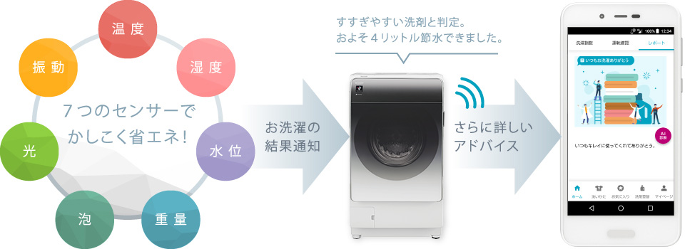 洗濯機に搭載された7つのセンサーを活かし、毎回のお洗濯の結果をお知らせしてくれます。