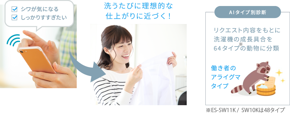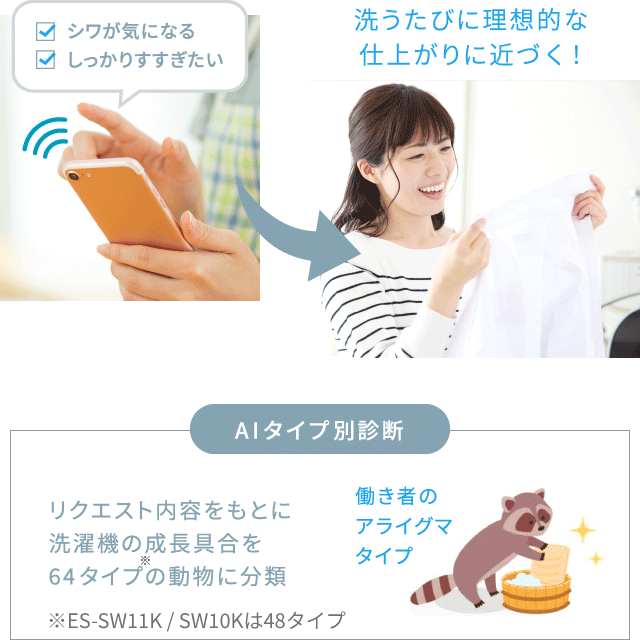 また、成長した洗濯機を64タイプの動物に例える「AIタイプ別診断」も搭載。洗濯をより楽しんでもらえるようになりました。
